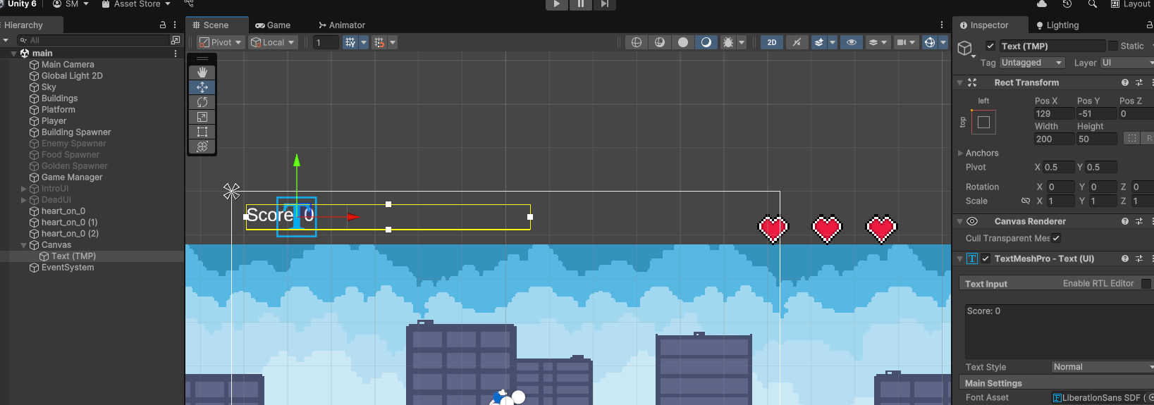 - 점수 표시를 위하여 Text UI를 추가한다.