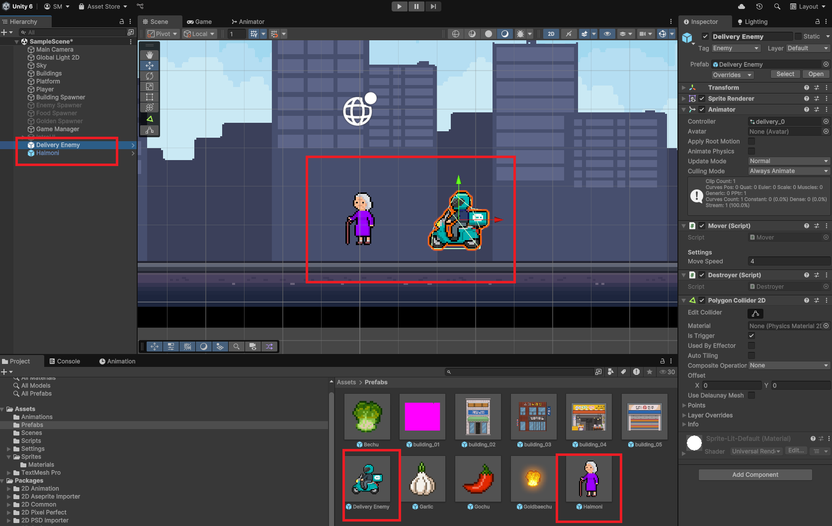 - Enemy Spawner를 생성하고, Spawner.cs를 추가하여, 할머니와 배달부의 Prefab을 넣는다.