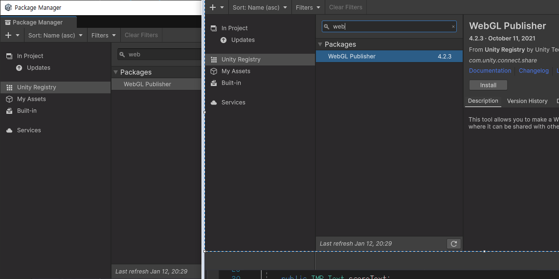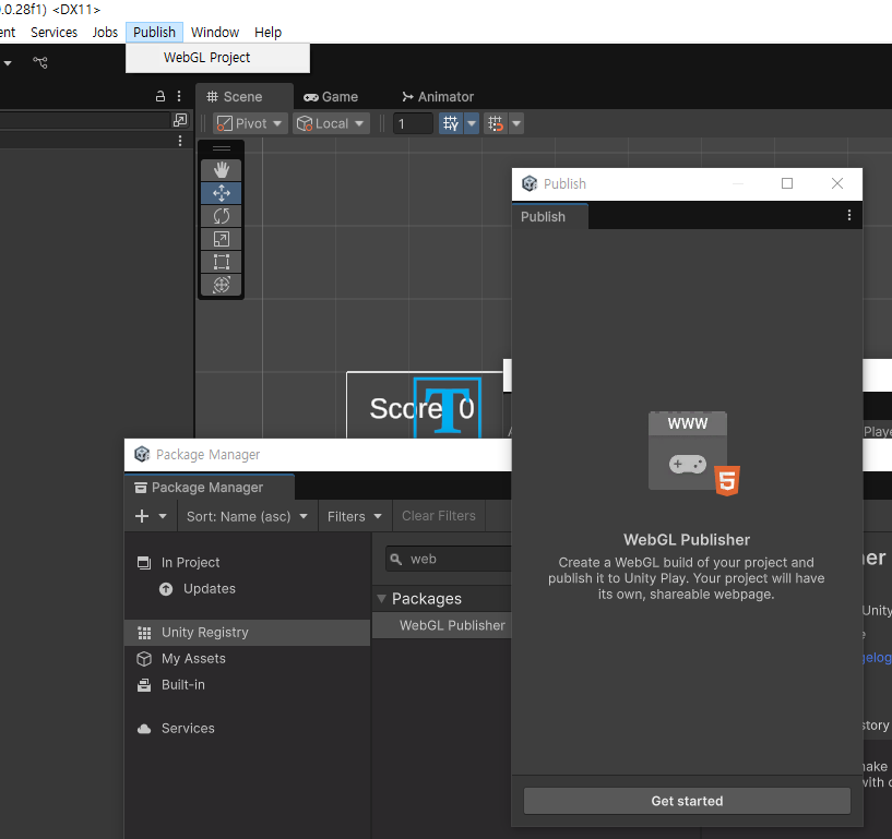 - Package Manager에서 WebGL Publisher를 설치한다.